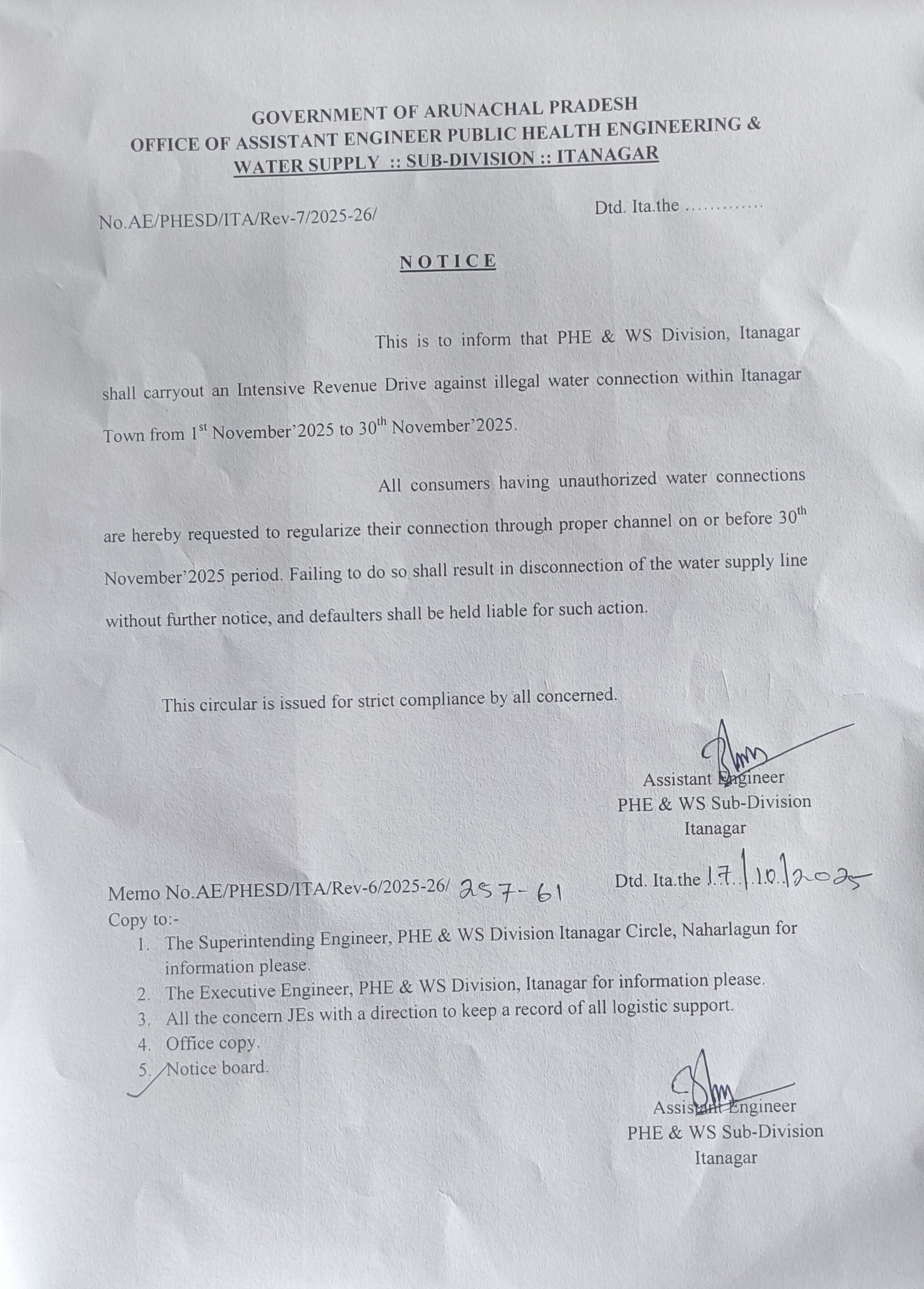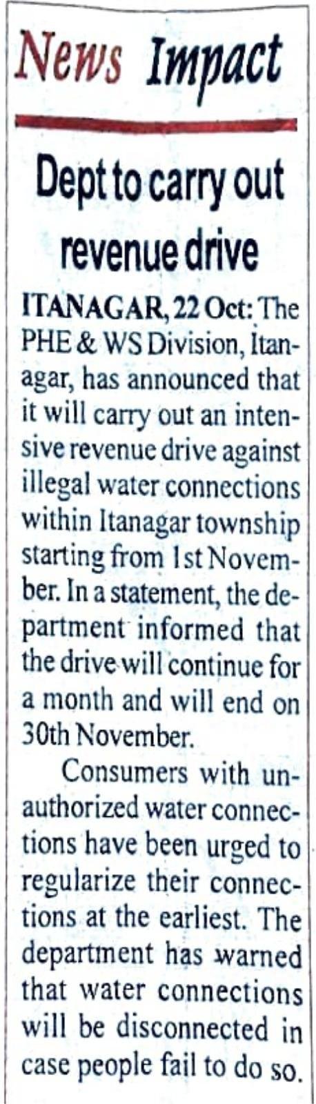 The PHE&WS Division Itanagar & Naharlagun have three Sub-divisions covers the jurisdiction of entire Itanagar Capital Region including Sangdupota circle. As per business allocation entrusted to PHE&WS Department, the divisions have carried out.